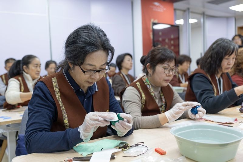 随后,湖北美术馆的志愿者团队为湖南省博物馆的志愿者们带来了一场别开生面的大漆美育课程——“不‘漆’而遇——大漆工坊”。课程中,志愿者们亲手实践,沉浸式学习了中国传统大漆工艺技法,感受了大漆温润如玉的质感与特有的纹理之美。一位志愿者激动地说:“亲手触摸到大漆的那一刻,我仿佛穿越了时空,与古老的荆楚文化有了亲密的接触。”荆楚地区作为漆艺的重要发祥地之一,其精湛的漆工艺和独特的审美风格让志愿者们赞叹不已。此次课程不仅是一次非遗文化的体验,更是一次文化传承的生动实践。
