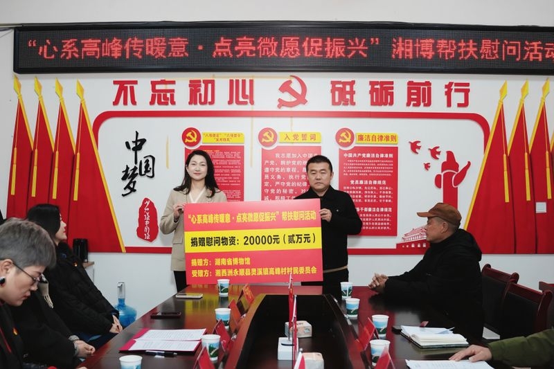 活动现场举行了帮扶物资捐赠仪式。湖南省博物馆向高峰村村委会捐赠生活用品、保暖衣物等慰问物资20000元。每一份物资都承载着湖南省博物馆对困难群众的深情厚谊,传递着社会大家庭的温暖与关爱。